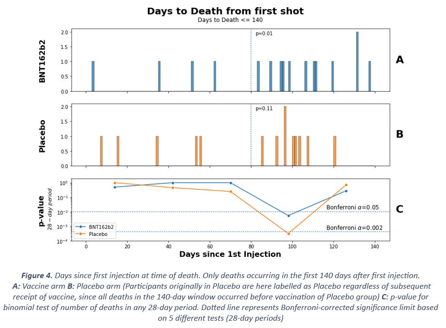 Importantly, the data reveals a statistically significant connection between mortality rate and time since injection, for both the placebo arm and the mRNA arm. Very few deaths happen during the first 80 days, while unexpectedly many deaths occur around 100 days since injection, in a manner that could not arise by chance.