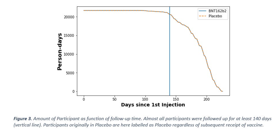 Trial participants were recruited at different times but the cut-off date for follow-up is the same for all, therefore not all participants will have experienced the same follow-up time. To account for this, we need to look at how many participants had been in the study for how many days at the cut-off date. For simplicity, let’s discount the fact that placebo arm participants were vaccinated, and consider them as placebo participants up until cut-off 15 March 2021. If there were truly no negative effects from the vaccine on mortality, then vaccination should have no mortality impact on the placebo arm. As can be seen in Figure 3, almost all participants had been part of the study for at least 140 days at the cut-off date 15 March 2021. With the null hypothesis assumption of the background death rate being constant, there should be no temporal difference in probability of deaths occurring during the first 140 days, since nearly all participants (95%) have been in the study for 140 days at by that date.