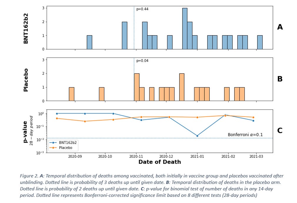 Curiously, very few deaths occurred in this period. So, few, actually, that around 1 November, the probability is only p = 0.04 (dotted vertical line chart B, Figure 2) that only 2 of the total 17 deaths in the placebo arm would occur in this time period, assuming that death rates are constant. Even though this is improbable, it might not alone be enough to raise questions. But if there are “too few” deaths in some periods, then there should be “too many” in other time periods. Looking at charts A and B in Figure 2, there appears to be multiple deaths around late December 2020, 6 of which occur in the vaccine arm. The probability of 6 out of the 21 deaths in the vaccine arm occurring within a matter of days from each other can be evaluated similarly to the previous method, by looking at the probability of occurrence for a moving period. We will use 28 days – four weeks – as the period, making for a total of 8 periods between 1 August 2020 and 15 March 2021. Chart C in Figure 2 shows that the pattern around December for the vaccine arm is slightly above the threshold of statistical significance with our conservative approach – the probability of 6 deaths occurring during 28 days by chance alone is p = 0.1 after Bonferroni-correction for 8 hypotheses.