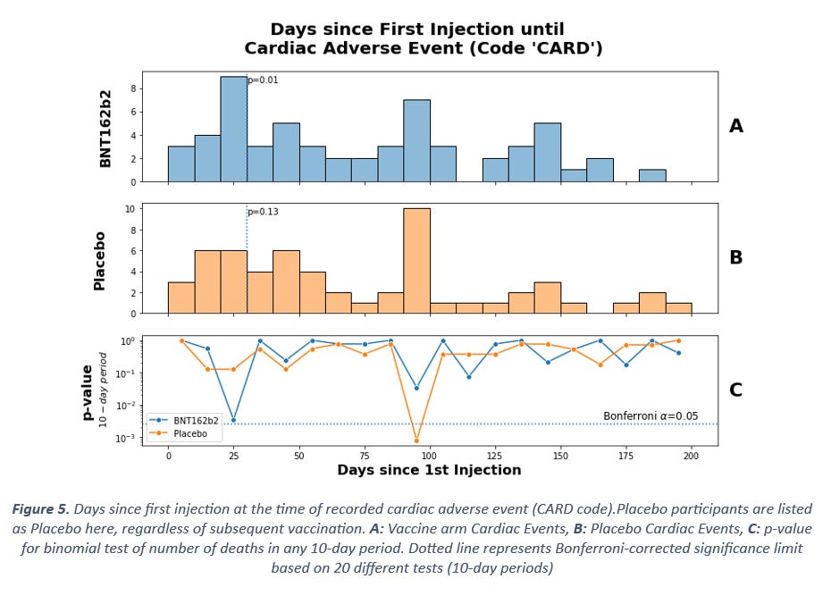 Cardiac SAEs in the trial also display highly unusual data patterns. Firstly, nearly half of all the cardiac events occur during the first 50 days since injection, whereas the risk exposure should be constant for the first 140 days. Secondly, there is a dramatic spike in cardiac events around 100 days from first injection in both the placebo and the vaccine arms – at the same time as the elevated rate of mortality.