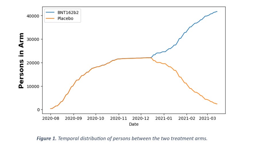 In the general population, the risk of death can be considered constant over a period of 6 months. Thus, in a study trial, the observed number of deaths should be unrelated to the study intervention and should be proportional to the number of people in the trial. As seen in Figure 1, the number of people in the trial arms is not constant over time. In the beginning, they were still recruiting people and later on, as participants in the placebo arm were vaccinated, that arm diminished in size.