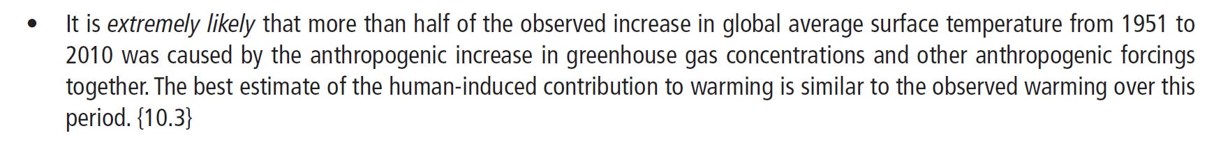 But when we look at the basis for the claim in Chapter 10 of the detailed Technical Summary, it is clear from the methods and results that the claim is based on various climate change simulation models, which reject the null hypothesis (that more than half the warming was not man-made) at the 5% significance level.