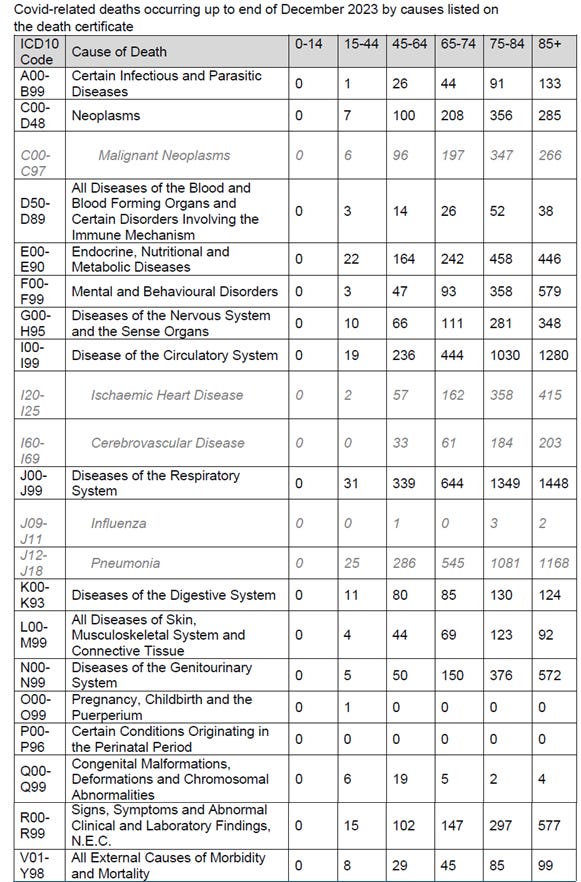 Kathy subsequently asked them to provide a full breakdown for the patients who died ‘with’ but not from covid by the other conditions mentioned on the death certificate by age group. The full response (19 April 2024) is here: