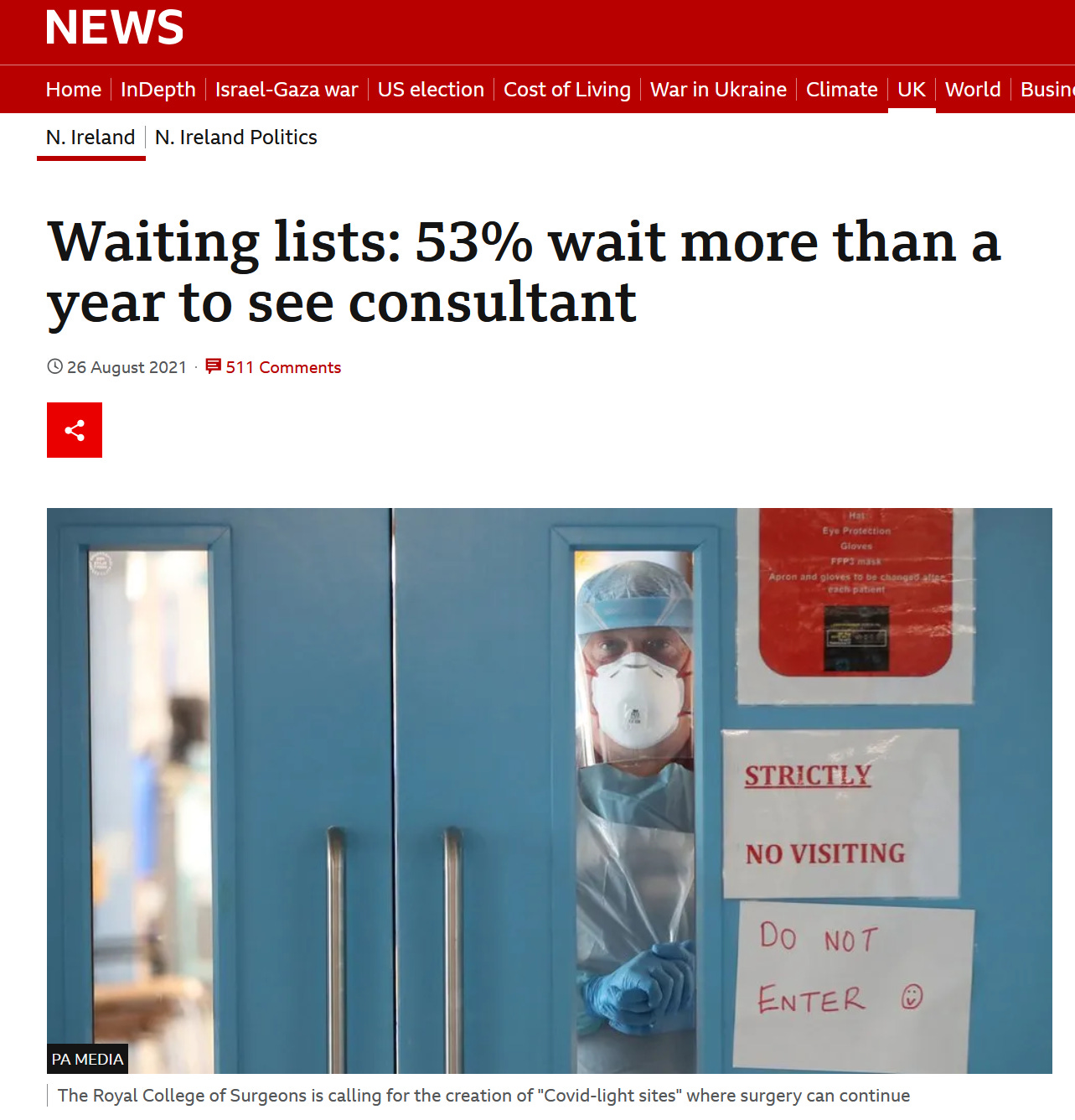 In August 2021, it was reported that 53% of patients wait more than a year to see a consultant. Mark Taylor from the Royal College of Surgeons said that behind the statistics were "patients waiting in pain, worry and in great distress".