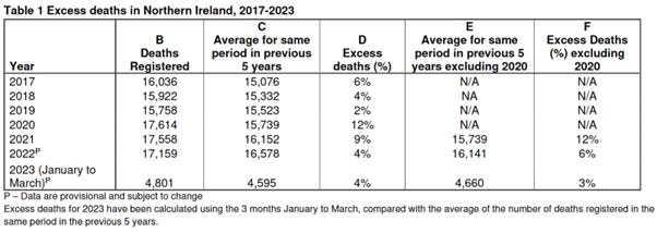 The ‘official’ excess deaths data from the Northern Ireland Government up until March 2023 is here. This is the key summary table they provide: