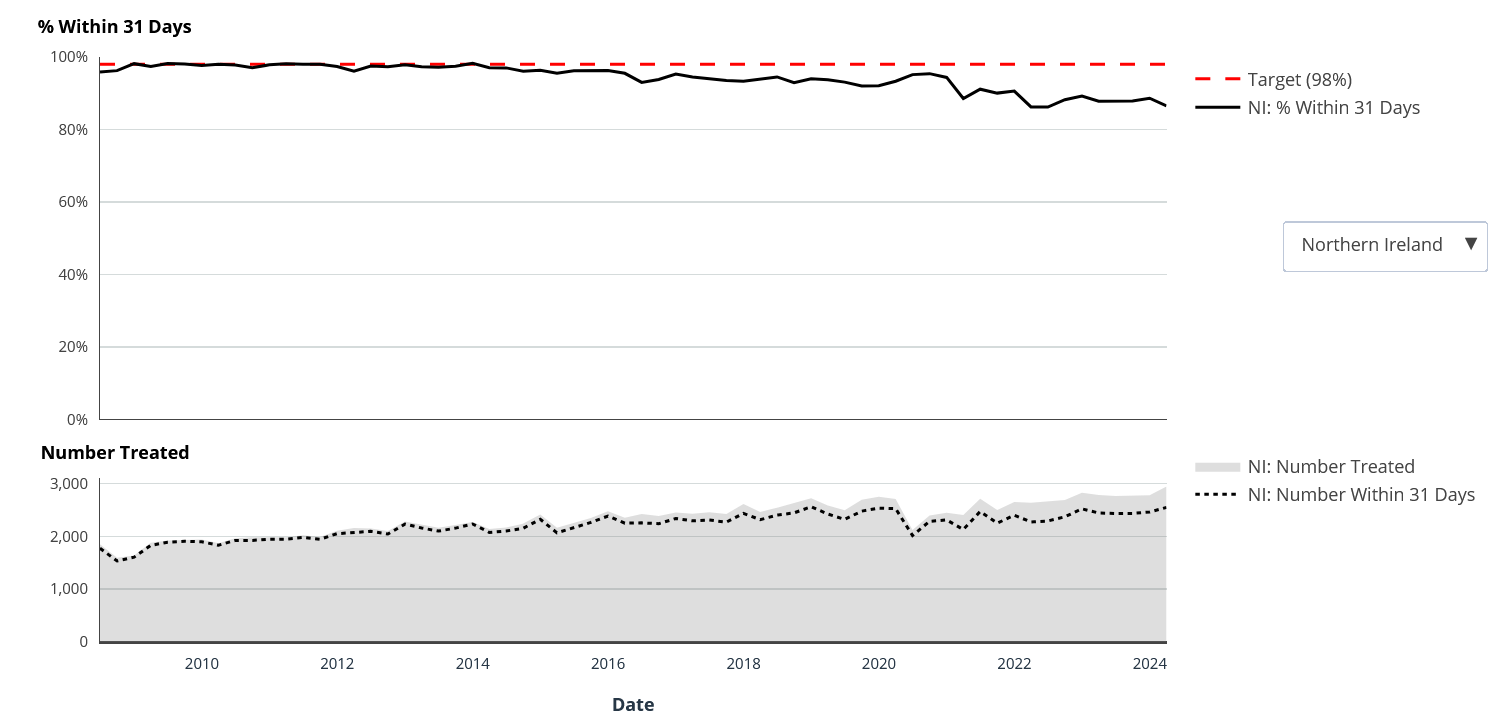 Just prior to the covid era (end Dec 2019) 94.4% were treated within 31 days of diagnosis but by March 2024 this dropped to 86.5%